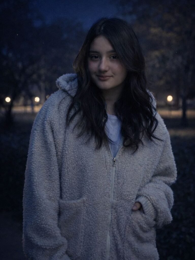 Use the uploaded image as the exact reference. Recreate the same composition, pose, framing, and perspective. Convert the scene into a realistic nighttime environment with natural dark blue night tones. Add subtle road or street lights in the background with a soft glow and deepen the background shadows. Illuminate the person slightly with soft ambient light (as if from a nearby street light) so the face and upper body are clearly visible while still maintaining a natural night look. Place 2–3 small faint stars in the sky. Ensure the result looks realistic, cinematic, and believable with balanced night lighting, not over-edited or artificial.