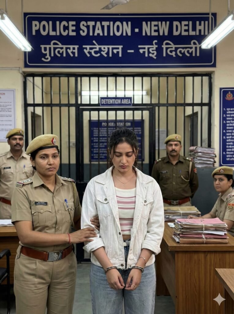 Generate A realistic, high-detail photograph of the interior of an Indian police station. In the center, a beautiful young girl,stands with her head bowed and a somber expression; she is wearing metal handcuffs. A female Indian police officer in a khaki uniform is holding her arm, escorting her. In the background, a prominent blue sign reads 'POLICE STATION - NEW DELHI ' in English and Hindi script. A barred gate labeled 'DETENTION AREA' is visible behind them, along with stacks of office files and other police officers in uniform. Authentic