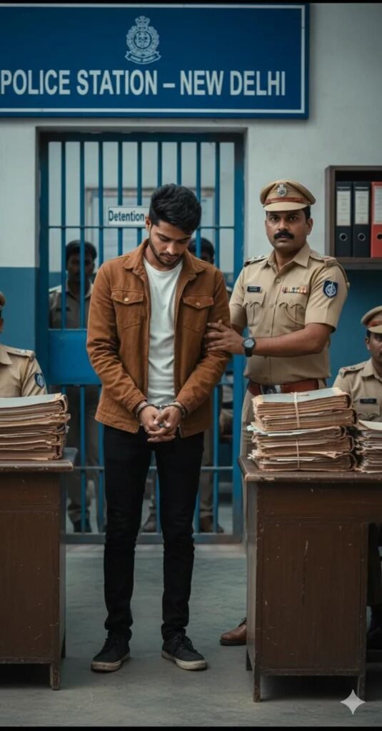 A cinematic, ultra-realistic scene inside an Indian police station in New Delhi.