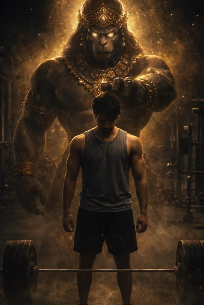 Create a highly dramatic and cinematic Person Behind him, generate a massive, divine, Hanuman ji with glowing red eyes and detailed golden jewellery. The divine figure should appear like a protective guardian emerging from smoke and shadows, placing a gentle, powerful hand over the man's head as if giving him strength. Use dark, moody lighting with strong contrast, gym environment details, smoke effects, rim lights, and hyper-realistic textures. Make the entire image intense, powerful, and motivating. Ultra-realistic, 8K, high detail, dramatic atmosphere