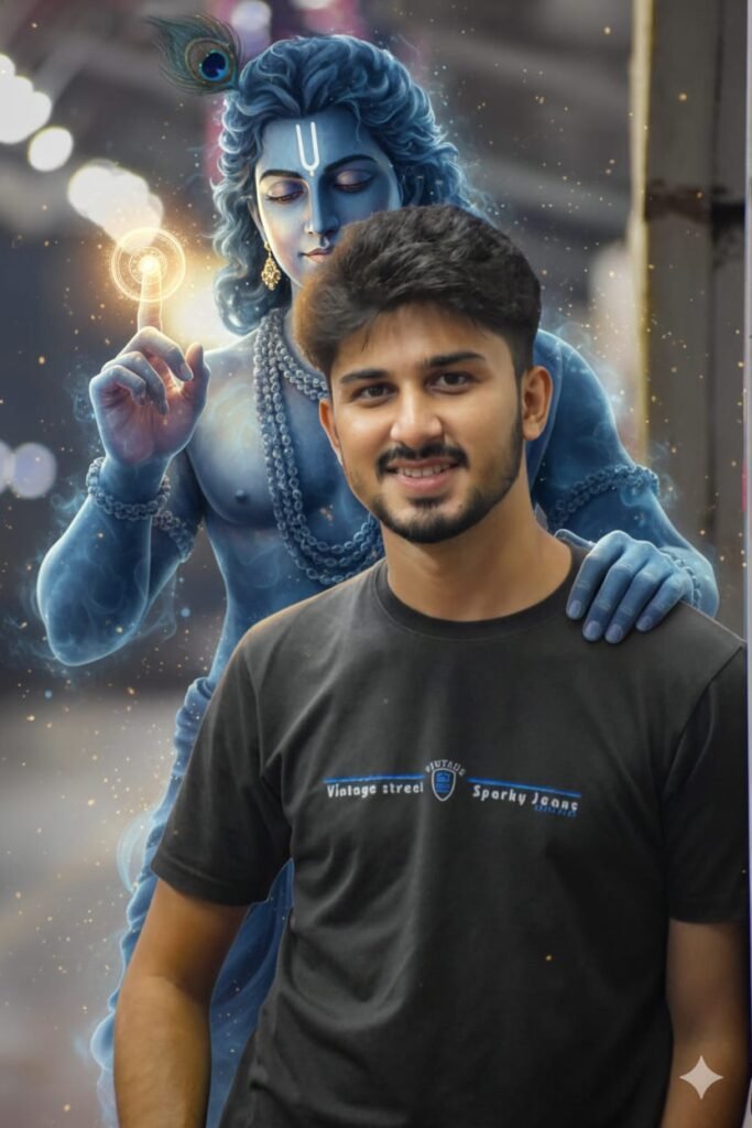 Behind the subject, manifest a divine appearance of Lord Krishna emerging naturally from the environment. Krishna must be large yet perfectly scaled to match the subject’s height, camera angle, and perspective.