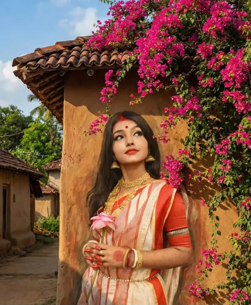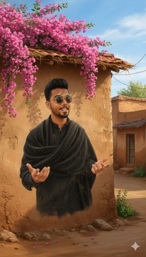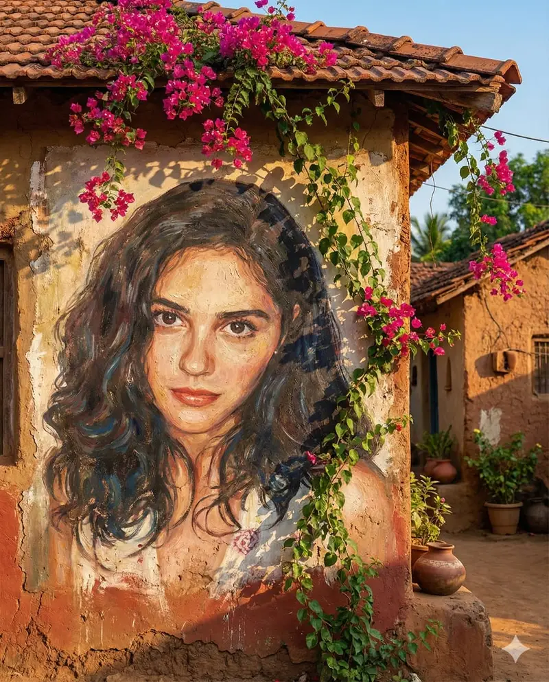 Turn the uploaded photo into a large, hand-painted mural on a rustic village wall with Brush paining effect. Preserve the exact face and expression. Add vibrant pink bougainvillea flowers cascading from the roof, wrapping naturally around the mural. Use warm sunlight, soft shadows, and earthy tones of mud houses in the background. Maintain high realism with a slight artistic mural texture on the wall. Blend the portrait seamlessly into the surface as if painted on it. Create a natural village street environment with clay tiles, sky, and greenery. Bright, colorful, authentic rural aesthetic.